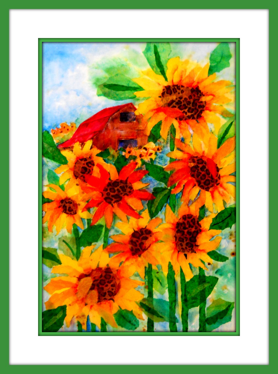 I enjoy combining collage with watercolor so I am always on the lookout for fun patterned papers. Tissue paper works especially well because it is somewhat transparent which is similar to watercolor paints. For Sunflower Barn I used some white tissue paper that I painted various shades of green along with some with designs already printed on them and leopard spot tissue for the centers of the sunflowers.